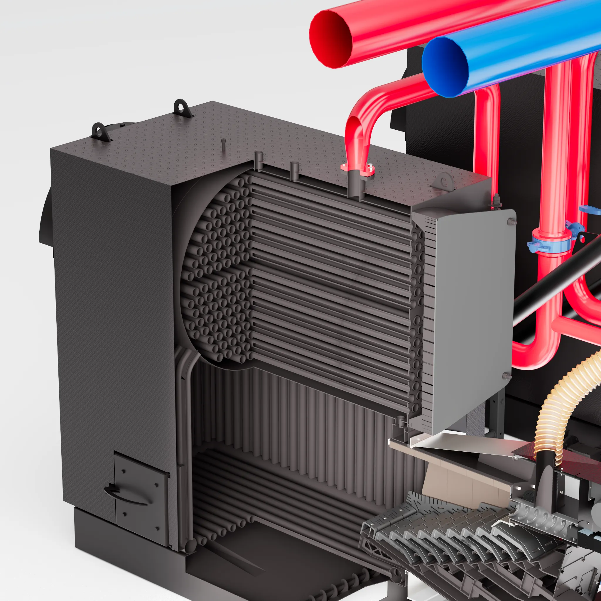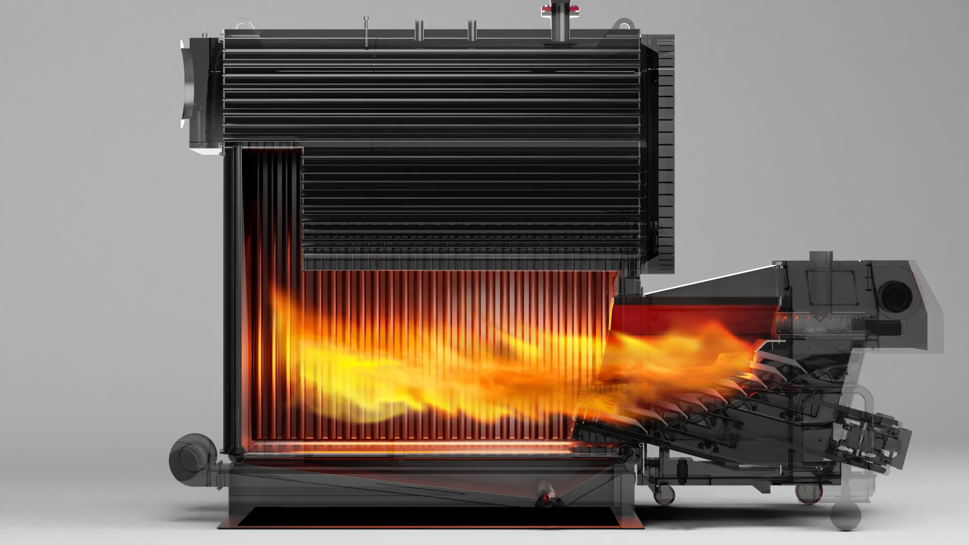 Высоко эффективная система сжигания, включаящая в себя вторичное и третичное дутьё подогретым воздухом в тандеме с системой подвижных колосников в горелке позволяют добиться максимальной глубины переработки топилва в тепловую энергию и соответствует нормам и требованиям европейских стандартов.