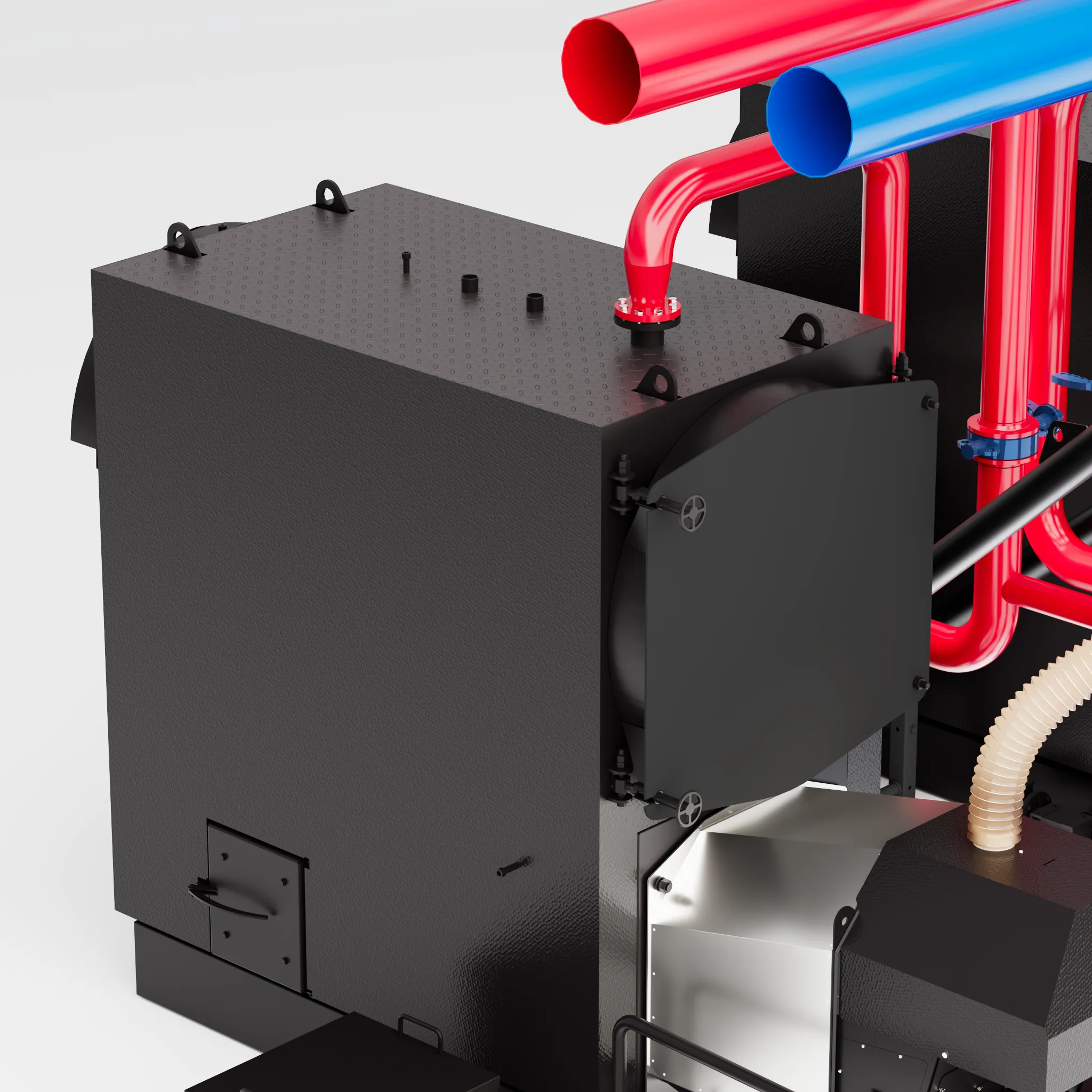 Специально спроектированный котел под физику горения в факельных горелках даёт максимальную компактность котельных установок среди всех доступных на рынке промышленных пеллетных котлов.